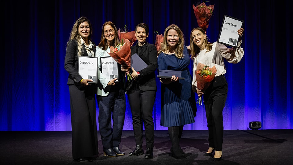 Vinnarna av "Sandviks hållbarhetspris till minne av Sigrid Göransson" kom i år från affärsområdessegmentet Sandvik Machining Solutions. På bilden syns Eva Kyriakopoulou, Sigrid Surkamp, Maria Alexandersson, Antonia Dåderman och Malvina Roci. Priset delades ut av Stefan Widing, vd och koncernchef på årsstämman den 29 april. Antonia deltog i ceremonin istället för pristagaren Jill Glynn som inte hade möjlighet att delta. Kathrin Lampel kunde inte heller vara med vid prisutdelningen.